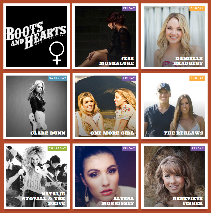 Note: There are other acts like Marshall Dane who have added Boots & Hearts to their schedule, but are not listed online. Perhaps there will be other female acts on that secondary list.